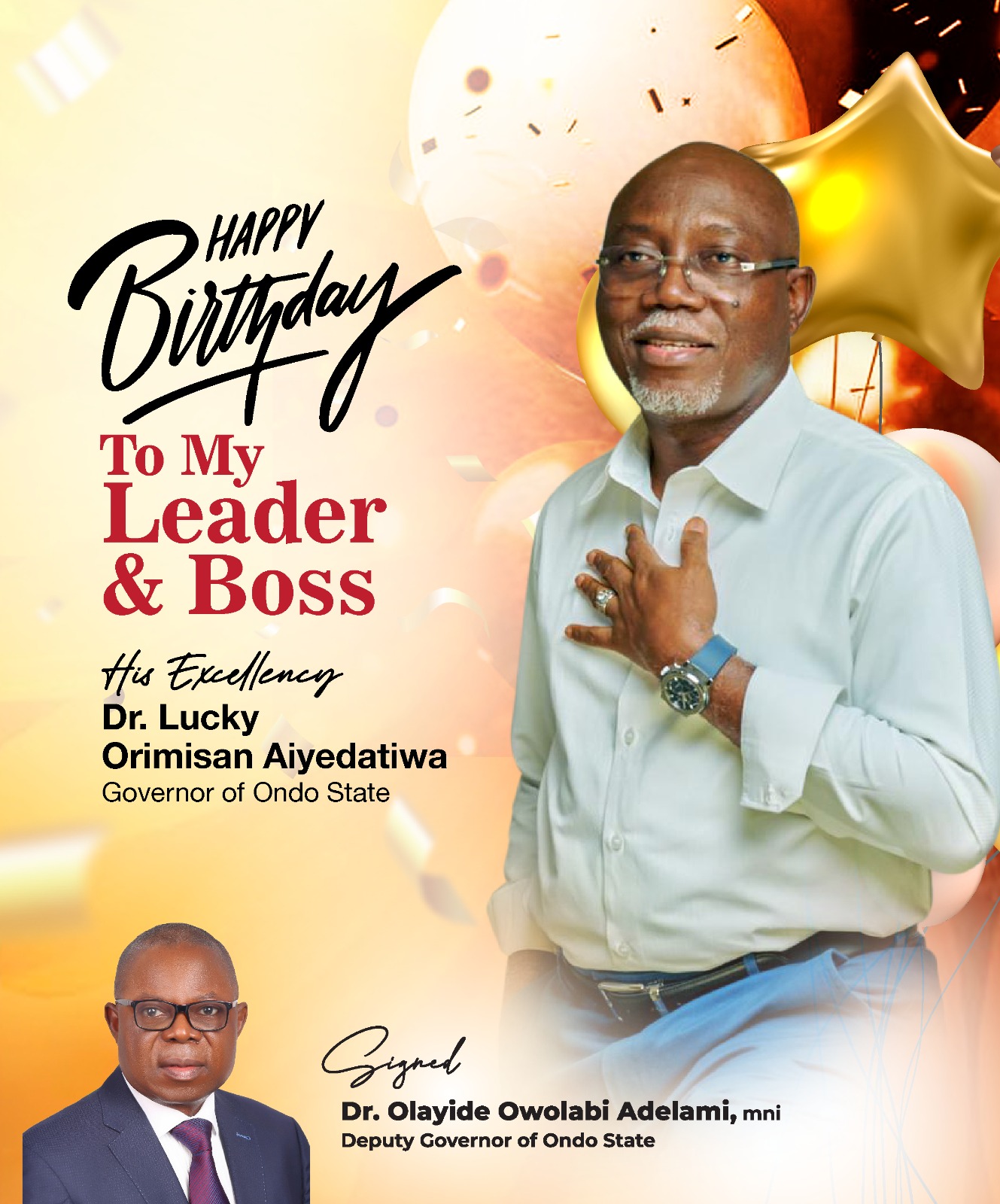 Ondo State deputy governor, Dr. Olayide Adelami, has sent a congratulatory message to his principal and leader, Governor Lucky Orimisan Aiyedatiwa, on the occasion of his 61st birthday, describing him as a visionary leader, bridge-builder, and steadfast servant of the masses.