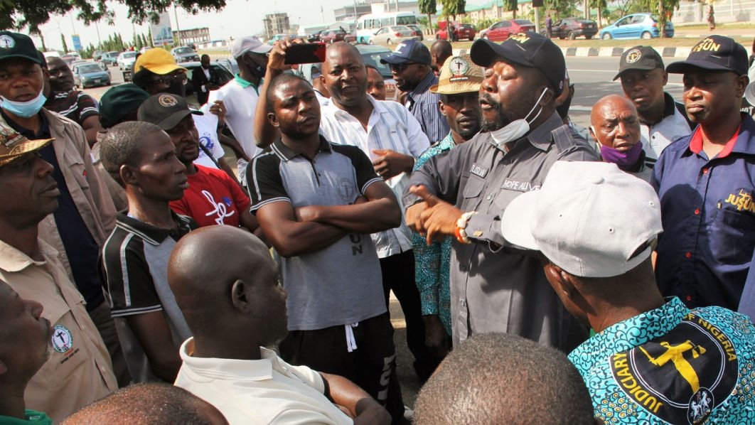 National Treasurer, Judicial Staff Union of Nigeria (JUSUN), Comrade Jimoh Alonge (right), addressing members during their peaceful protest at the Court of Appeal in Abuja. Photo: Philip Ojisua