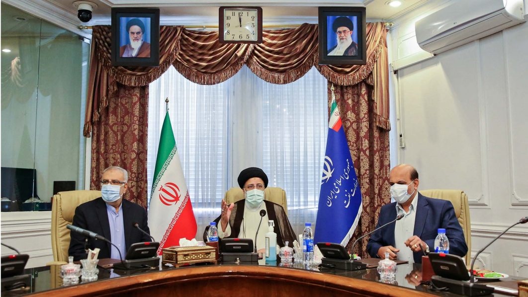 A handout picture provided by the Iranian presidency on October 27, 2021, shows Iranian President Ebrahim Raisi (C) visiting the ministry of oil to follow up on latest issues caused in the fuel distribution system. – Iranian authorities blamed a mysterious cyberattack for unprecedented disruption to the country’s fuel distribution network. (Photo by Iranian Presidency / AFP)