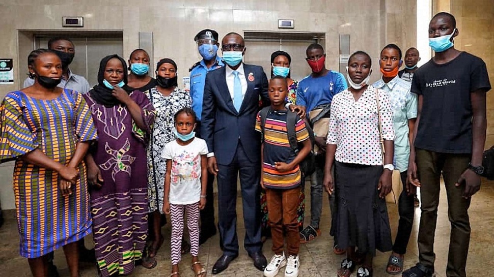 Left behind: Chairman, Board of Trustees, Lagos State Security Trust Fund (LSSTF), Mr. Kehinde Durosimi-Etti; Executive Secretary/CEO, LSSTF, Dr. Abdurrazaq Balogun; Lagos State Governor, Mr. Babajide Sanwo-Olu and Commissioner of Police, Lagos State, Hakeem Odumosu with families of police officers who died during the riots that followed the #EndSARS protests … in Civic Centre, Victoria Island yesterday