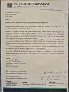 “Please, be informed that after wide consultations with my political leaders, teeming allies and supporters, and indeed my entire political structure, I, Hon (Dr.) Eric Oluwole A.E, the ADC State Vice Chairman who oversees the Ondo Central Senatorial District of Ondo State, hereby voluntarily resign my membership of the African Democratic Congress, ADC due to the irreconcilable differences over the leadership crisis bedeviling the ADC.