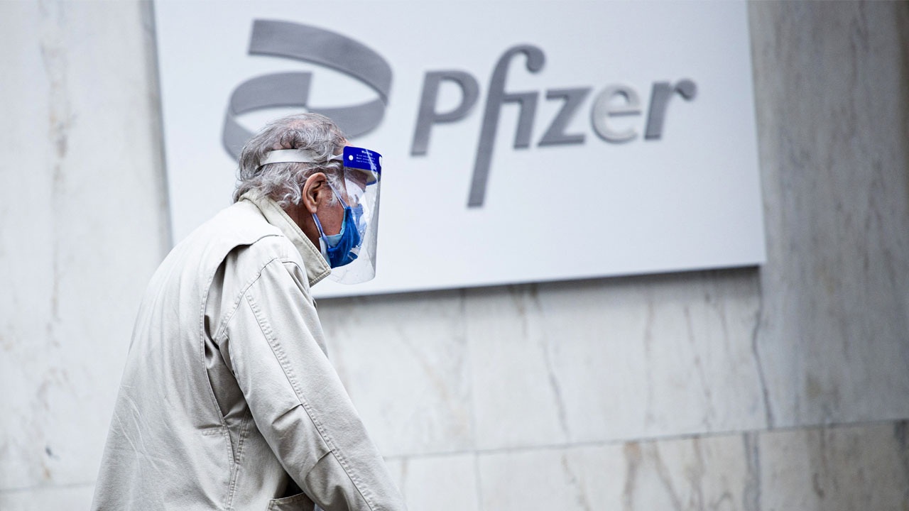 In this file photo a man wearing facemask and shield walks past the Pfizer headquarters in New York on March 11, 2021, one year after the pandemic was officially declared. – Pfizer sharply increased its projections for 2021 revenues and profits on May 4, 2021, citing much higher sales from its Covid-19 vaccine sales.The drugmaker now estimates 2021 revenues of $26 billion from the vaccine, up from $15 billion previously and reflecting 1.6 billion doses expected to be delivered this year under contracts signed through mid-April. (Photo by Kena Betancur / AFP)