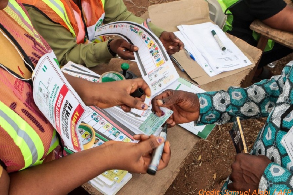 A polling station official marks a voter’s finger with a marker pen before he casts a ballot at a polling station in Ibadan on February 25, 2023, during Nigeria’s presidential and general election. (Photo by Samuel Alabi / AFP)