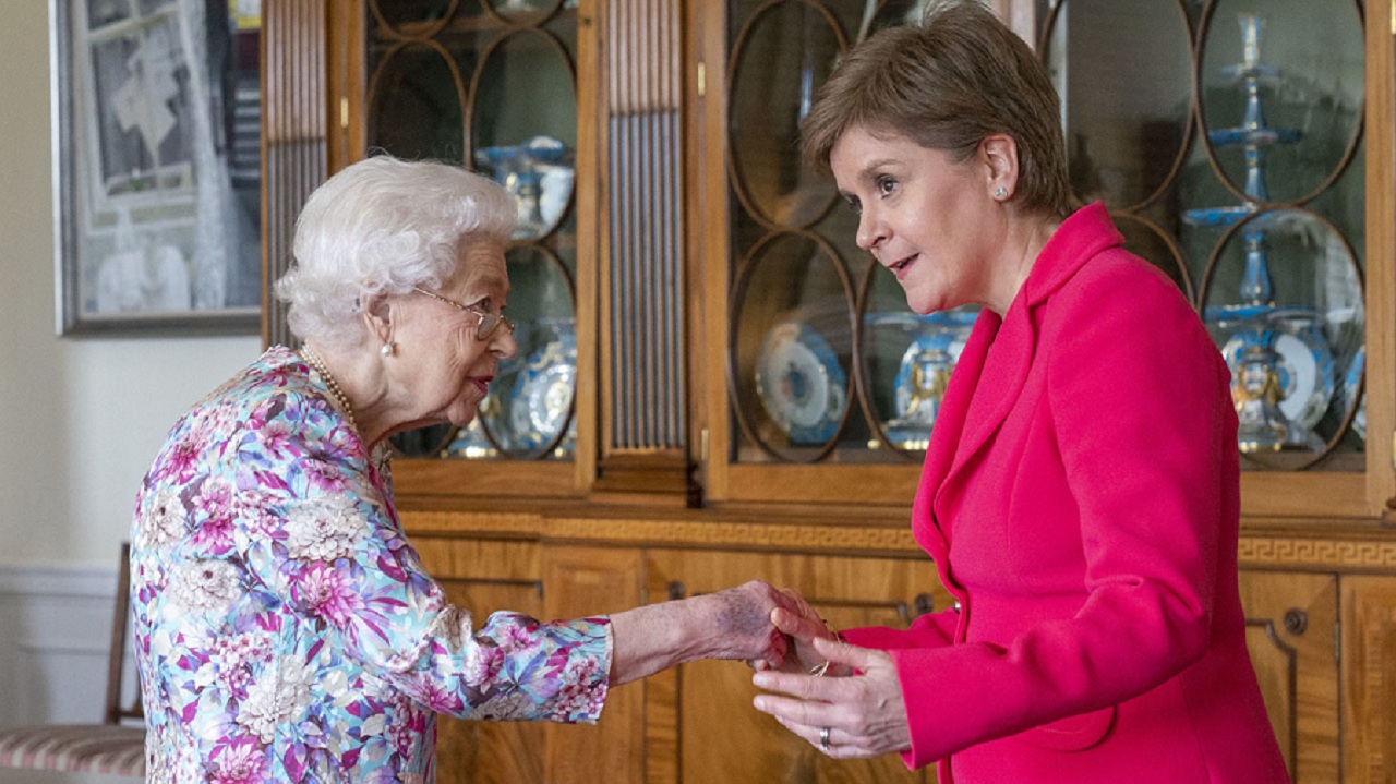Britain’s Queen Elizabeth II (L) greets Scotland’s First Minister and leader of the Scottish National Party (SNP), Nicola Sturgeon, during an audience at the Palace of Holyroodhouse in Edinburgh, Scotland, on June 29, 2022. (Photo by Jane Barlow / Pool / AFP)