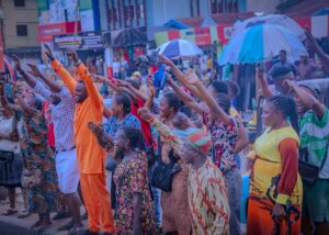 The tumultuous crowds, waving, singing and dancing, lined up the route, took over the roads and major streets leading to the Moshood Abiola Democracy Park at the popular Oja Oba Market in the heart of Akure, venue of the ecstatic reception.